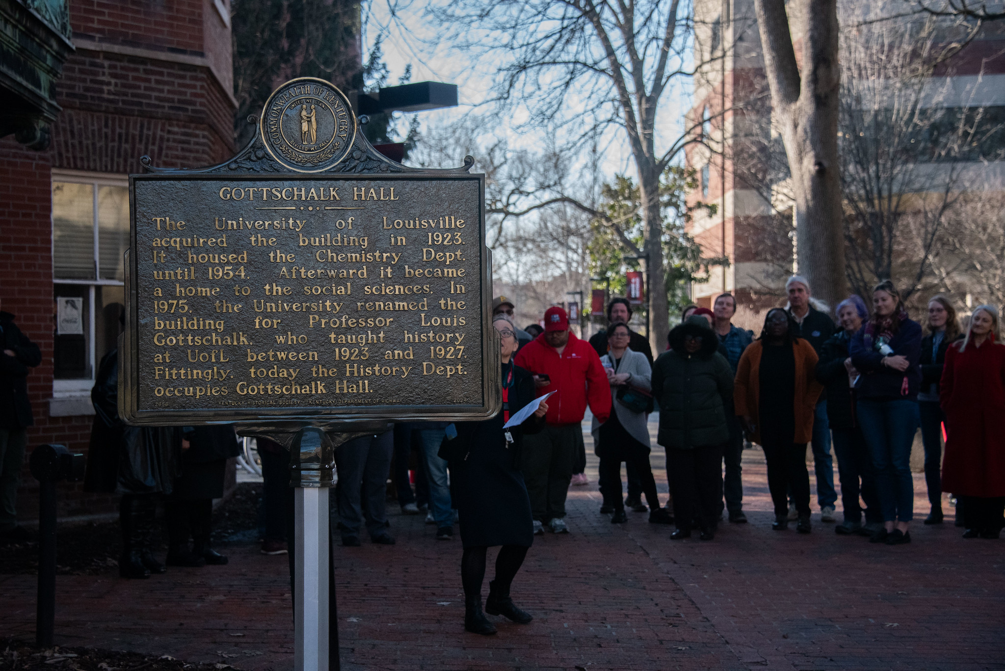 The most recent addition to the historical markers at UofL, Gottschalk Hall, the longtime home of the history department. The unveiling ceremony was held in February 2025.