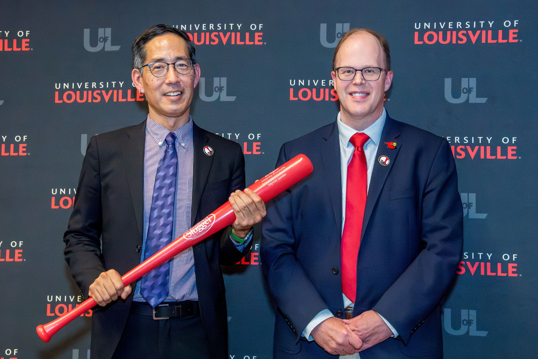 Kenneth Palmer, UofL School of Medicine associate dean of research, (right) presents a commemorative bat to Research!Louisville 2025 keynote speaker, Kei Koizumi.