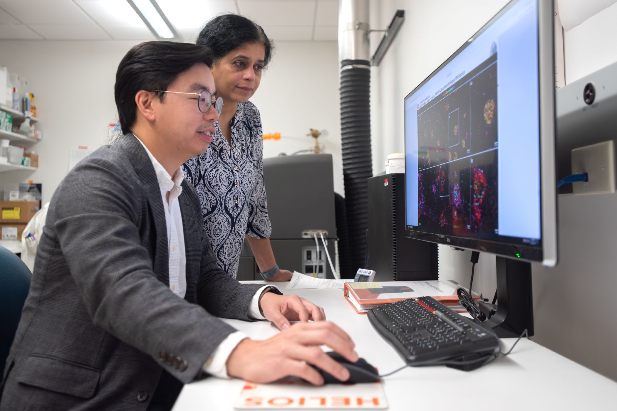 Joseph Chen, left, and Kavitha Yaddanapudi, CCII researchers, using the CyTOF instrument for cancer immunotherapy research.