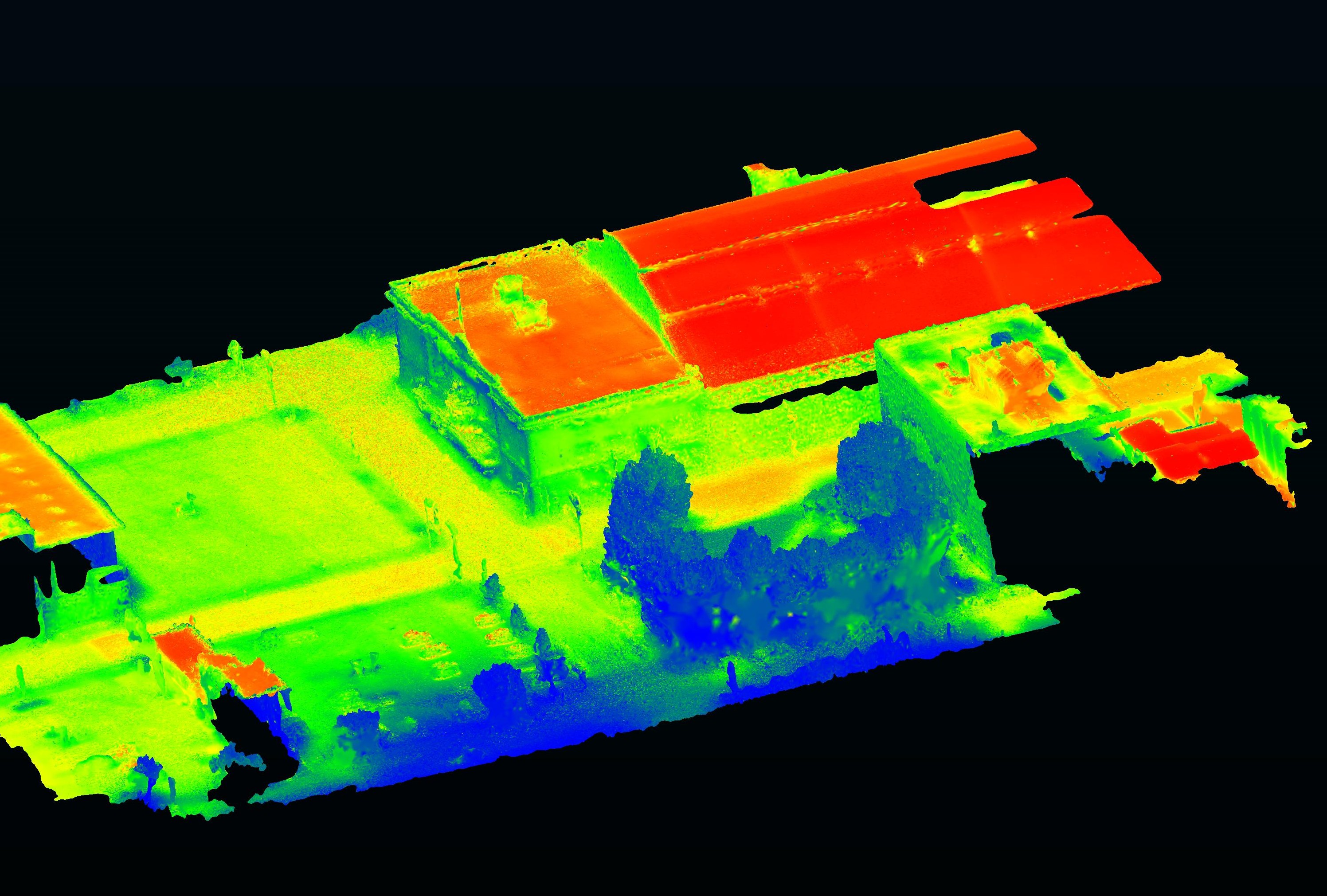 Thermal image showing relative temperature for different surfaces surrounding the Trager MicroForest in downtown Louisville.
